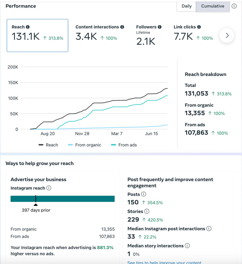 ✅ Gained 1000+ followers (over 100 per month on average)✅ 160% more reach and 380% more Organic reach per month on average✅ 6000% more engagement (more people like, share and comment) on average per month✅ 350% more profile visits per month on average✅ Business became fully booked for the first time within first 3 months. Consistently booked since.